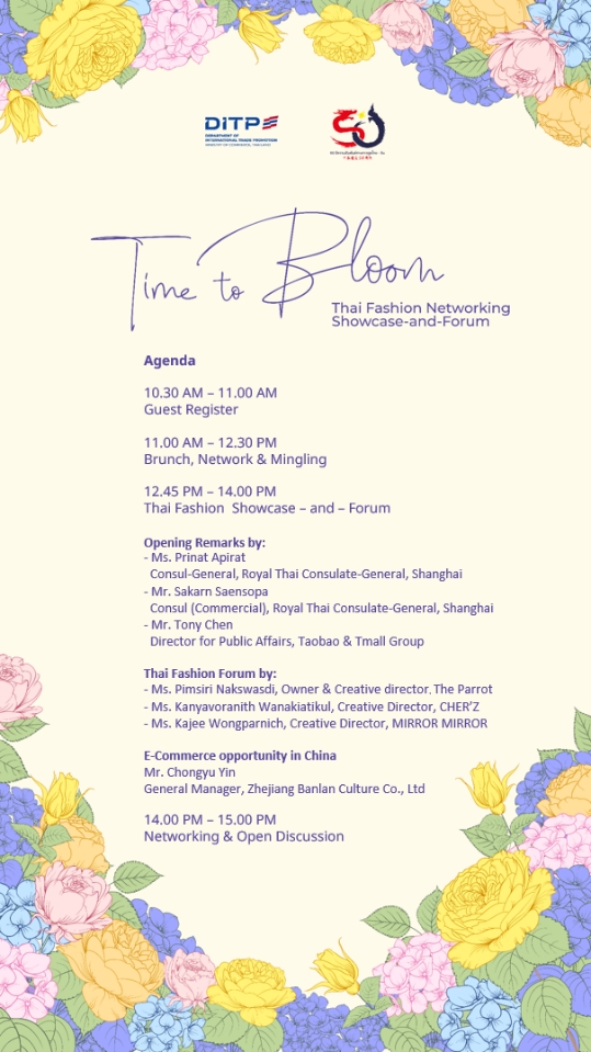 9月24日,由泰王国驻上海总领事馆商务处(DITP)主办的“Thai Fashion Networking Showcase-and-Forum”于上海徐汇区长乐花园成功举办。本次活动以“Time to Bloom”为主题,旨在搭建泰国品牌与中国市场之间的沟通桥梁,进一步提升泰国时尚、珠宝与生活方式品牌在中国消费者与商业平台中的知名度与影响力。