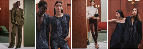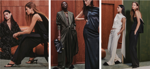 本季女装系列色调以克制而深邃的中性色为主,黑、白、灰、酒红与苔绿相互交织,于不同面料间折射出细微层次,面料通过亮片织物、缎面丝绒与柔软针织等材质,搭配自由的剪裁与流动的廓形营造戏剧张力,呈现华丽而内敛的节庆氛围。天鹅绒外套以轻盈光泽铺陈夜色时分,搭配同材质长裤,展现从容而不失锋芒的夜宴气场;缎面露背上衣与垂坠长裤相衬,行动间流露优雅姿态;褶裥礼服散发出柔和的律动感,双排扣西装以挺阔轮廓平衡浪漫与力量,每一件单品都为派对造型赋予了独特的视觉张力。配饰亦呼应整体造型,以仿皮草包袋、金属耳环与醒目的手镯增添节庆气息,在细节处延展浪漫温度。