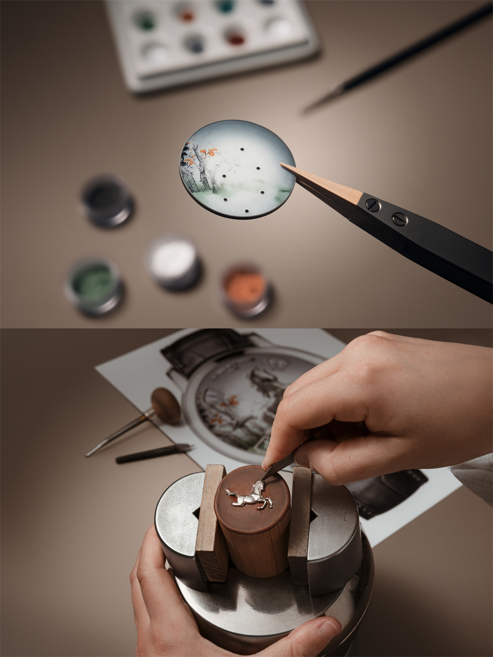 骏马和岩石图案由手工雕刻大师以18K白金或粉红金材质雕琢而成,入微刻画出马鬃和马尾等传神细节,并通过手工氧化着色工艺,进一步凸显图案的纹理质感和轮廓线条。微绘珐琅工艺赋予色彩更微妙的变化。整个图案的创作过程极为精细,共需要三天时间。