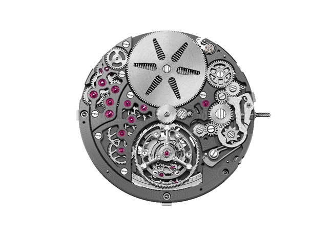 自动上链浮动式陀飞轮,配备小时计时盘与瞬跳分钟计时盘的飞返计时功能,小时,分钟显示