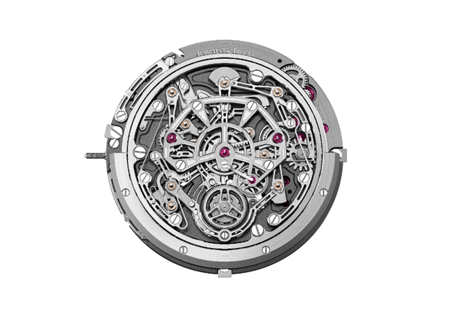 爱彼工程师研发出全新专利机制,可同时优化机芯与短行程、低阻力按钮的能量传输。这一创新机制以齿轮齿条系统为基础,取代传统的心形凸轮和归零锤。通过将能量储存在齿条中,该装置使轮系持续保持张力,避免计时指针发生抖动,同时无需使用现代计时码表中的摩擦弹簧(用于在计时功能运行过程和归零时实现恒定制动作用)。最终的结果是两种方式的能耗相似,但此前被消耗的能量得以储存起来。