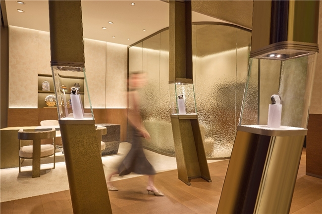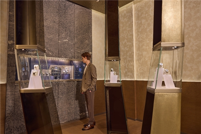 步入其中,层层递进的发现之旅随之展开。接待区拥有舒适的休息座椅,纹理玻璃设计令人联想到汝山谷中的潺潺流水。空间中央,极具雕塑感的树状装置,以现代手法重释爱彼制表工坊四周的自然风光。棱角分明的树干承托起一个个水晶材质展示柜,陈列其中的最新时计作品仿佛悬浮其间,向欣赏者近距离展现高级制表的艺术造诣。