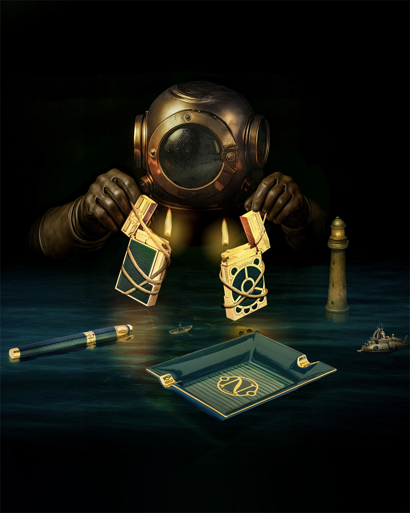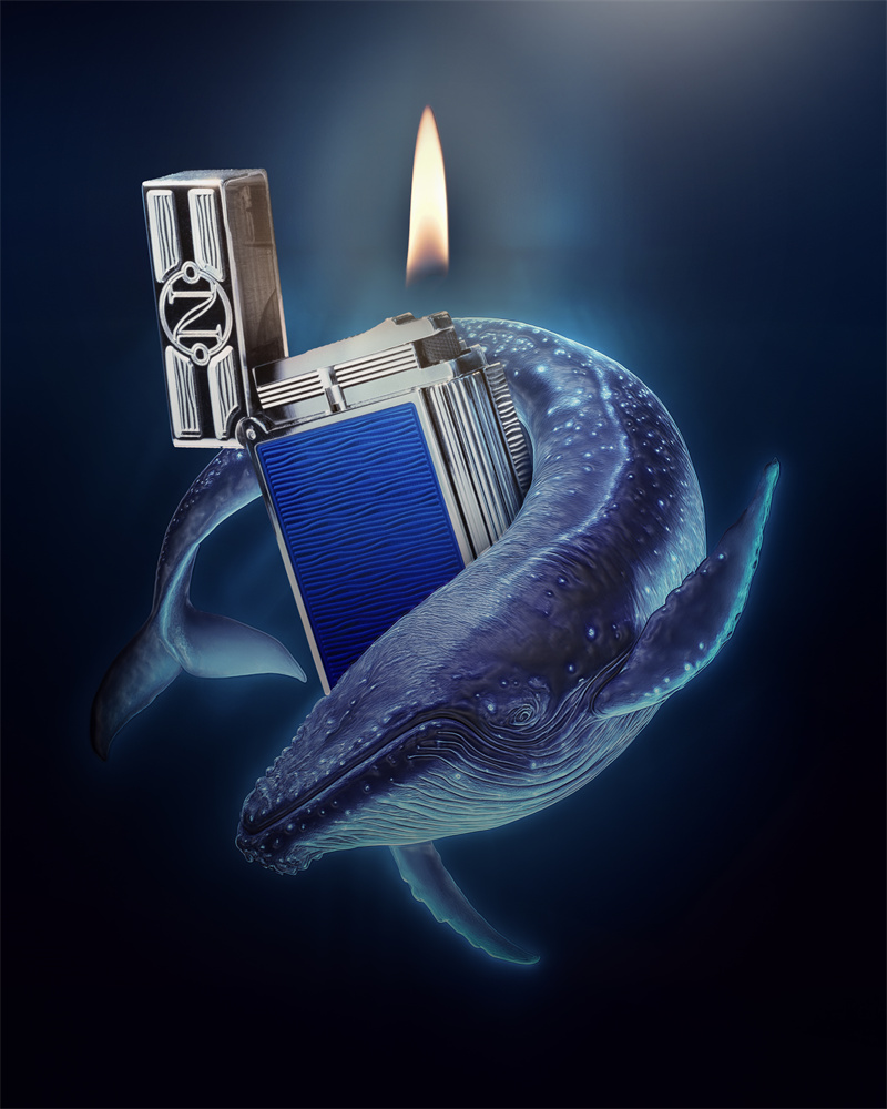 从碧绿到深蓝,随着海湾暖流领略不同深度带来的神秘壮阔,以深海蓝调为设计灵感,打造海底两万里限量系列蓝银款,同样包含:Ligne 2朗声系列打火机、主题雪茄剪、雪茄套与烟缸。