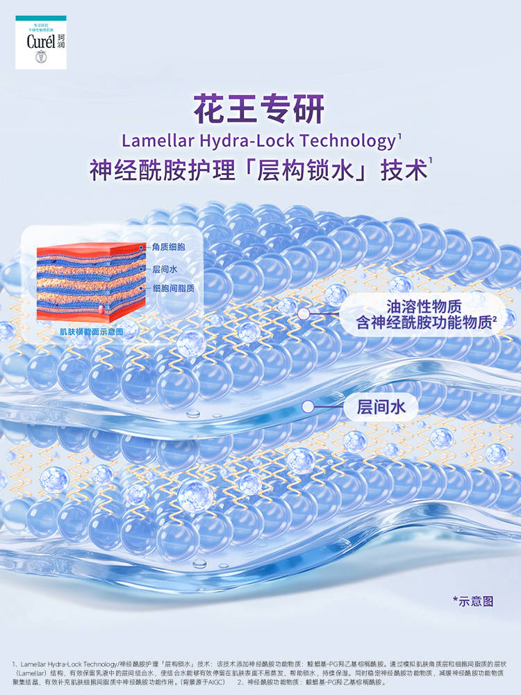 15、该技术添加神经酰胺功能物质:鲸蜡基-PG羟乙基棕榈酰胺。通过模拟肌肤角质层和细胞间脂质的层状(Lamellar)结构,有效保留乳液中的层间结合水,使结合水能够有效停留在肌肤表面不易蒸发,帮助锁水,实现持续保湿。同时稳定神经酰胺功能物质,减缓神经酰胺功能物质聚集结晶,有效补充肌肤细胞间脂质中神经酰胺功能作用。